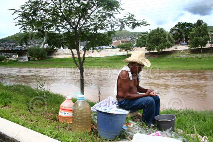 OAXACA, OAXACA, 01JULIO2009.- José Luís Velásquez de 69 años originario de Miahutlan Porfirio Díaz se dedica a la recolección de embases de vidrio, mismos que raspa y lava para ocuparlos como contenedores de Mezcal que vende de 3 a 8 pesos dependiendo el tamaño, en una jornada de 7 a.m. a 7 de la noche, donde desde las 10 a.m. se instala en riveras del Atoyac. Aprovechando la creciente del rió para recolectar agua y tener los envases recolectados y limpios para llenarse. FOTO: MAX NÚÑEZ/CUARTOSCURO.COM