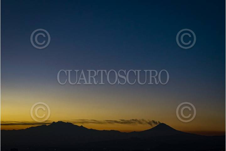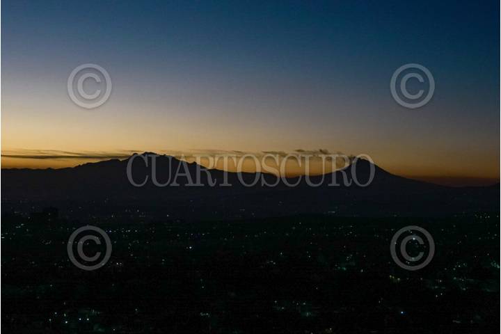 CIUDAD DE MÉXICO 04ABBRIL2025.- Tonos azuales y amarillos enmarcan la silueta de los volcanes Iztaccíhuatl y Popocatépetl, de la misma forma estos tonos pintan las calles de la ciudad, durante las primeras horas de este viernes FOTO:ROGELIO MORALES/CUARTOSCURO.COM