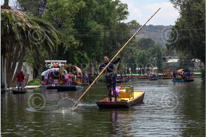 CIUDAD DE MÉXICO 12ABRIL2025.- Una mujer recorre el canal de Xochimilco sobre una trajineras, en busca de vender manzanas con caramelo y botanas en el Embarcadero de Nativitas. FOTO: ROGELIO MORALES CUARTOSCURO.COM