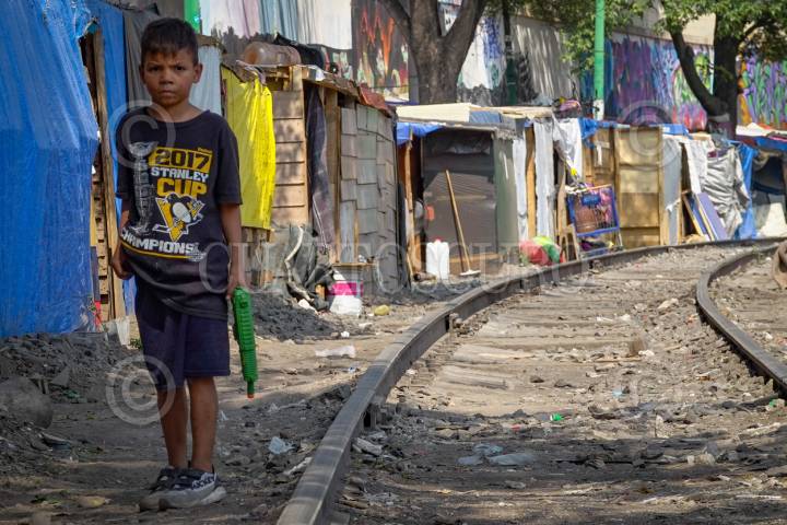 CIUDAD DE MÉXICO 30ABRIL2025.- En el marco del Día del niño y de la niña, un niño migrantes observa directamente a la cámara mientras sostiene una pistola de juguete entre hogares imporvisados con madera, cartón y lonas en la Colonia Vallejo. FOTO: ROGELIO MORALES CUARTOSCURO.COM