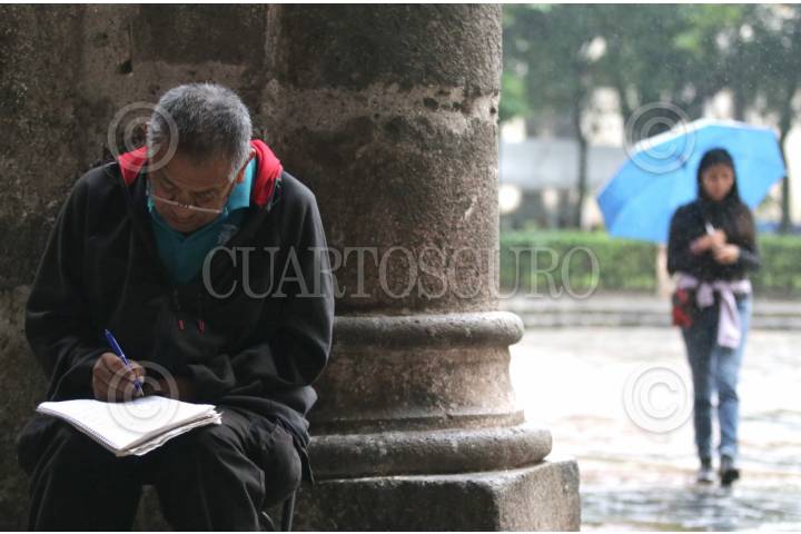 CUERNAVACA, MORELOS, 22JUNIO2025.- Escena cotidiana en la Catedral de la capital de Morelos, un hombre escribe en un cuaderno, mientras detrás una joven camina bajo la lluvia del mediodía. FOTO: MARGARITO PÉREZ RETANA/CUARTOSCURO.COM