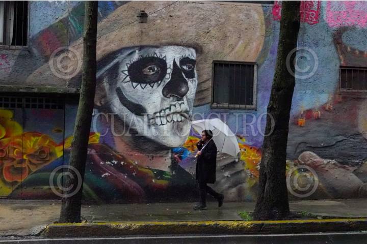 CIUDAD DE MÉXICO, 02AGOSTO2025.- Un hombre con paraguas en mano, camina frente a un mural alusivo al Día de Muertos en la alcaldía Magdalena Contreras. FOTO: ROGELIO MORALES /CUARTOSCURO.COM