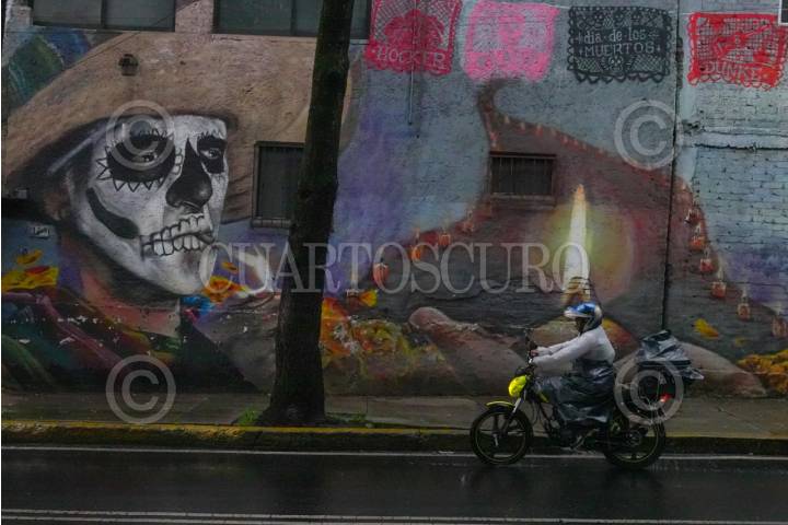 CIUDAD DE MÉXICO, 06AGOSTO2025.- En la ciudad de México cada semana mueren cerca de 5 motociclistas en accidentes viales, esto según datos de la Secretaría de Movilidad (Semovi) en su último Reporte Trimestral de Hechos de Tránsito del año pasado. En imagen aspectos de motociclistas frente a un mural alusivo a la celebración de Día de Muertos. FOTO: ROGELIO MORALES /CUARTOSCURO.COM