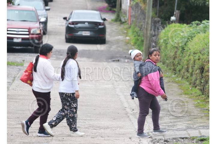 TEPOZTLÁN, MORELOS, 24AGOSTO2025.- Imagen cotidiana en la comunidad de San Juan Tlacotenco, tres mujeres, una de ellas cargando un niño en su espalda sujetado con un reboso, caminan en una calle de este pueblo. FOTO: MARGARITO PÉREZ RETANA/CUARTOSCURO.COM