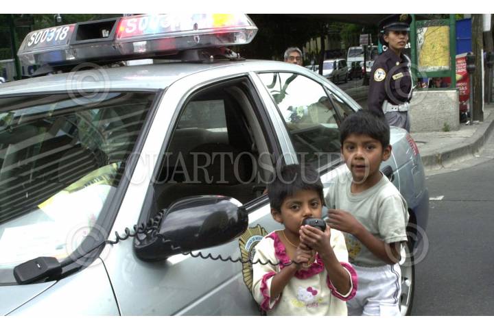 MEXDF20MAYO2004.- Unos niños juegan con la radio de un policia en avenida Reforma. FOTO: Eunice Adorno/CUARTOSCURO.COM
