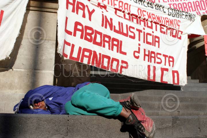 México, D.F., 28DICIEMBRE2004.- Un fatigado protestante descansa en las escaleras de la Asamblea Legislativa. FOTO: Moisés Pablo/CUARTOSCURO.COM