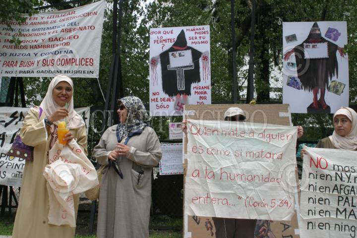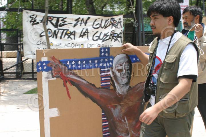 México, D.F. 04 JULIO 2004.- Algunos creadores se reunieron a las afueras de la embajada de Estados Unidos para manifestar su repudio a las acciones belicas de dicho país, y realizaron una exposición llamada "creadores en guerra, contra la guerra". FOTO: Sandra Perdomo/CUARTOSCURO.COM