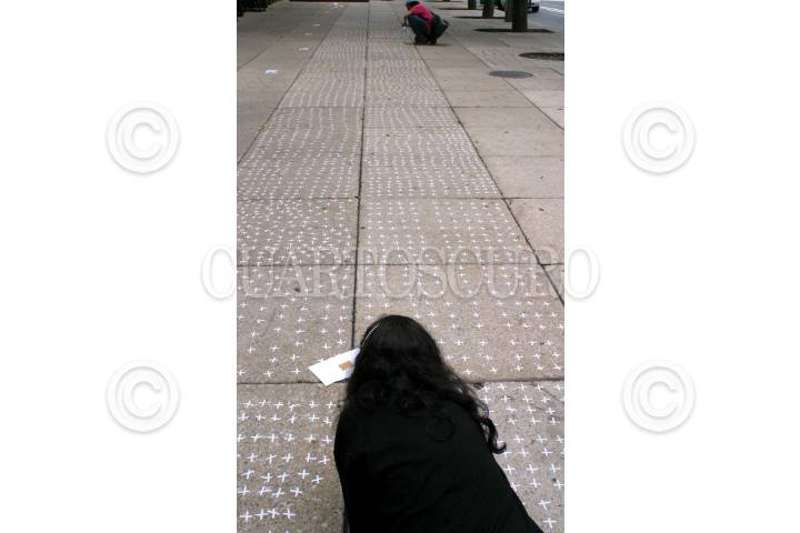 México, D.F. 04 JULIO 2004.- Algunos creadores se reunieron a las afueras de la embajada de Estados Unidos para manifestar su repudio a las acciones belicas de dicho país, y realizaron una exposición llamada "creadores en guerra, contra la guerra". En memoria de los muertos tapizaron un tramo de la banqueta de Av. Reforma con cruces. FOTO: Sandra Perdomo/CUARTOSCURO.COM