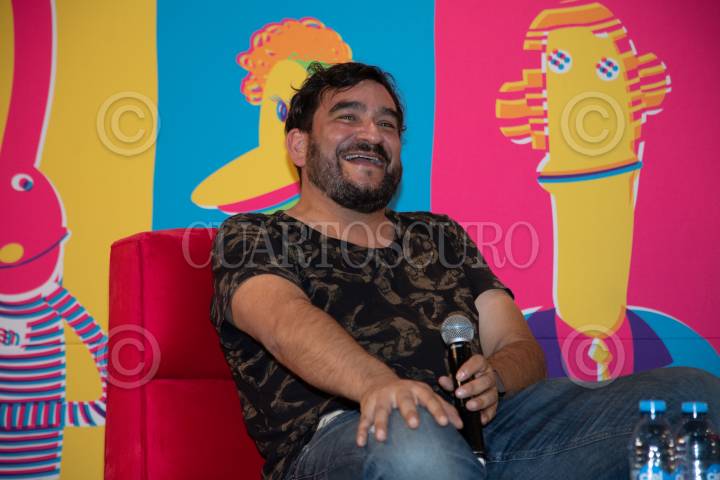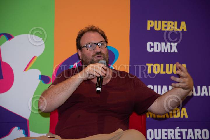 Pedro Peirano coocreador del programa 31 Minutos en conferencia de prensa para presentar las fechas de su espectáculo titulado "Yo nunca vi televisión", que recorrera algunos lugares de la República Mexicana.