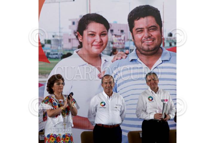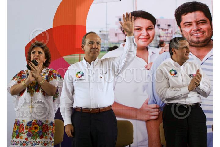 MERIDA, YUCATAN, 25FEBRERO2010.- El presidente Felipe Calderón acompañado de la gobernadora del estado Ivonne Ortega y de Heriberto Félix Guerra, secretario de Desarrollo Social durante la entrega de Oportunidades Crece para Vivir Mejor que se realizo en esta ciudad. FOTO: ALFREDO GUERRERO/CUARTOSCURO.COM