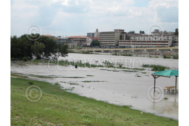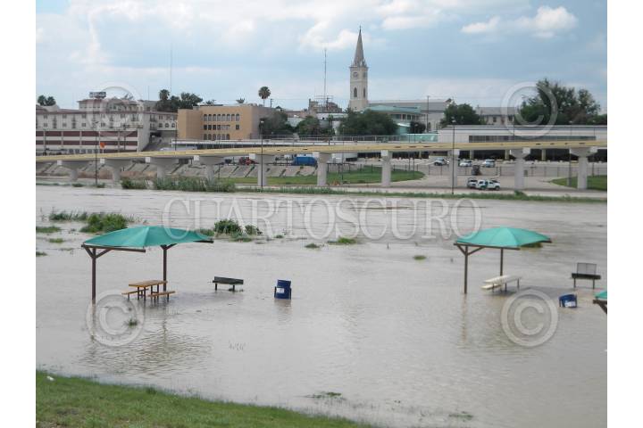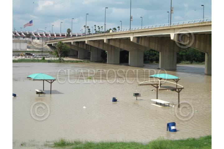 NUEVO LAREDO, TAMAULIPAS, 07JULIO2010.- El caudal del Río Bravo se ha incrementado en las últimas horas por el desfogue de las presas de la region que estan a su maxima capacidad y la cresta mayor de esta creciente se espera el día de mañana en que subirá once metros por encima de su nivel normal, en tanto que autoridades toman providencias ante la posiblidad de cerrar los puentes internacionales y la llegada a esta ciudad de damnificados procedentes del municipio de Anahuac del estado de Nuevo León. FOTO: GABRIEL GONZALEZ VALVERDE/EL DIARIO DE NUEVO LAREDO/CUARTOSCURO.COM