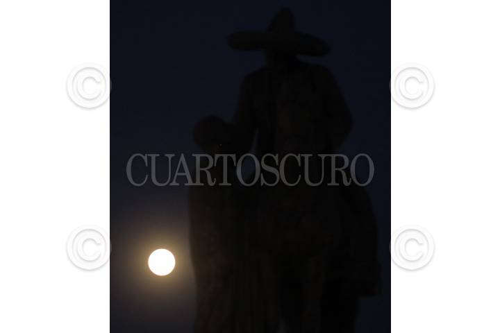 CUAUTLA, MORELOS, 18ABRIL2019.- A un día que la luna se llene de luz se pudo ver en esta ciudad muy luminosa y grande. En la imagen el satélite a un lado de una estatua del General Emiliano Zapata junto a un campesino. FOTO: MARGARITO PÉREZ RETANA /CUARTOSCURO.COM