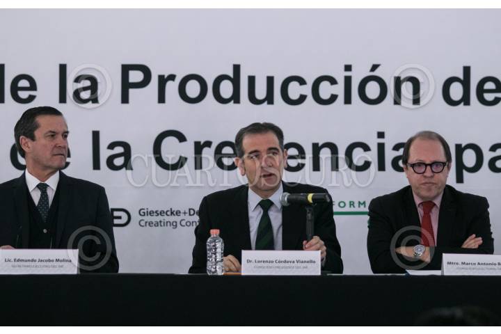 Edmundo Jacobo, consejero Electoral, Lorenzo Cordova Vianello, consejero presidente del Instituto Nacional Electoral (INE), y Marco Antonio Baños, consejero electoral, durante el inicio de producción del nuevo modelo de la credencial para votar.