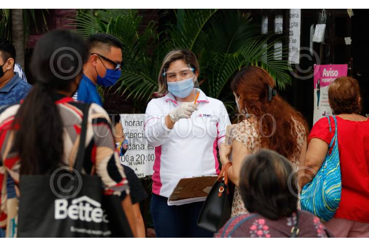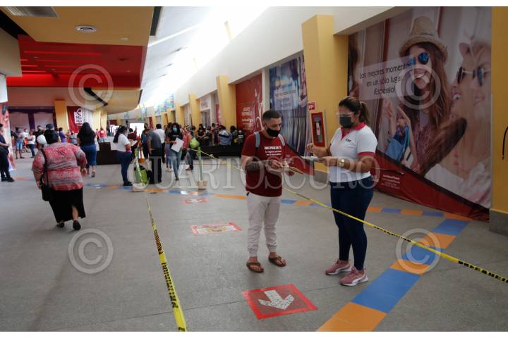 Una trabajadora del INE revisa que las persona que asisten al trámite traigan sus papeles completos.