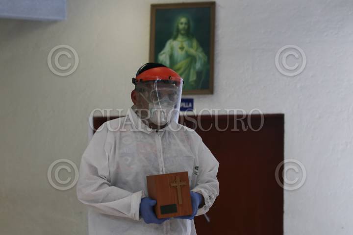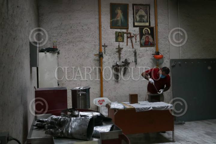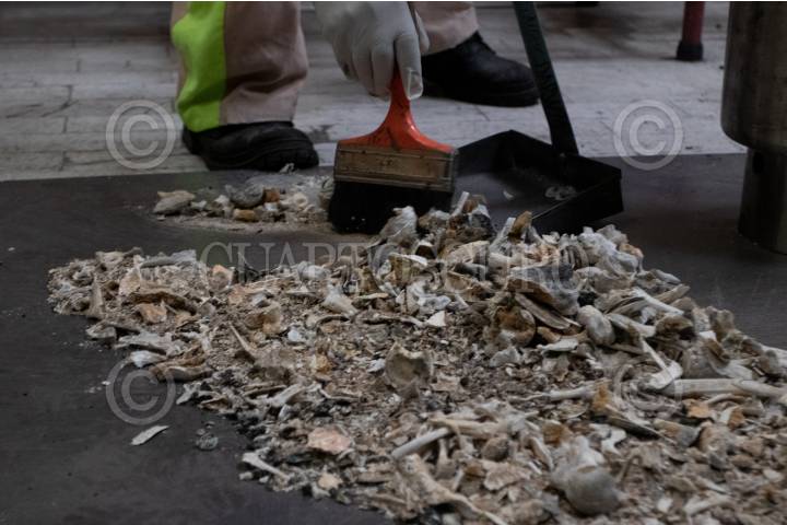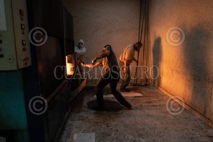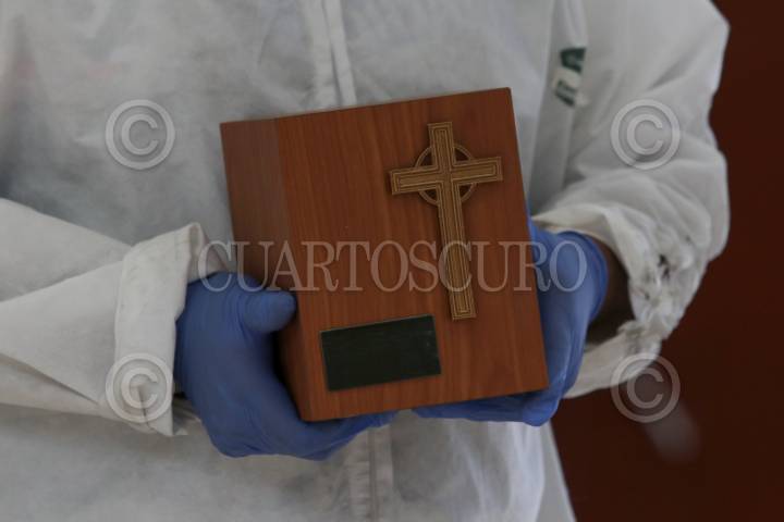 Un cremador sostiene los restos de una muerte natural en el Velatorio Xilotepec
