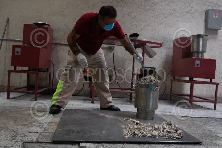Un cremador recoge las cenizas de una muerte a causa de Covid-19 en el Velatorio San Isidro