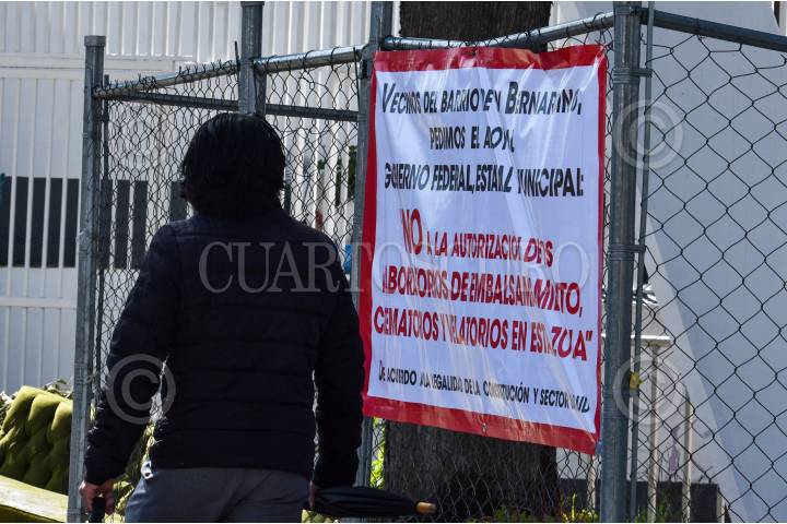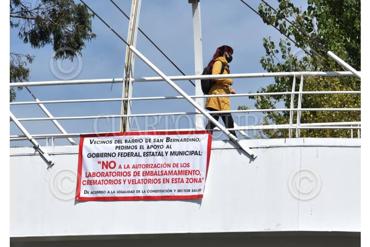 Vecinos del Barrio de San Bernardino en Toluca colocaron mantas contra la operación de laboratorios de embalsamamiento, crematorios y velatorios en esa zona.