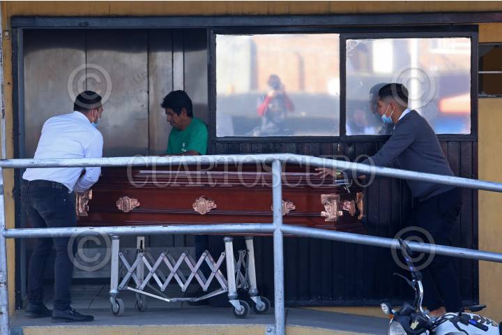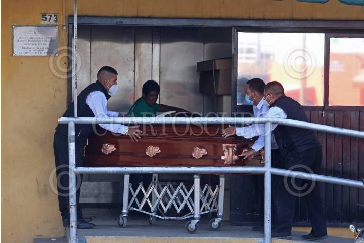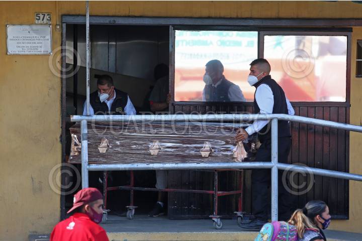 Trabajadores de una funeraria transportan hasta las puertas del Crematorio Nueva Vida, el cuerpo de una persona fallecida por covid-19.