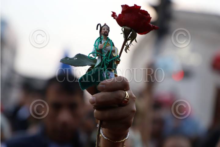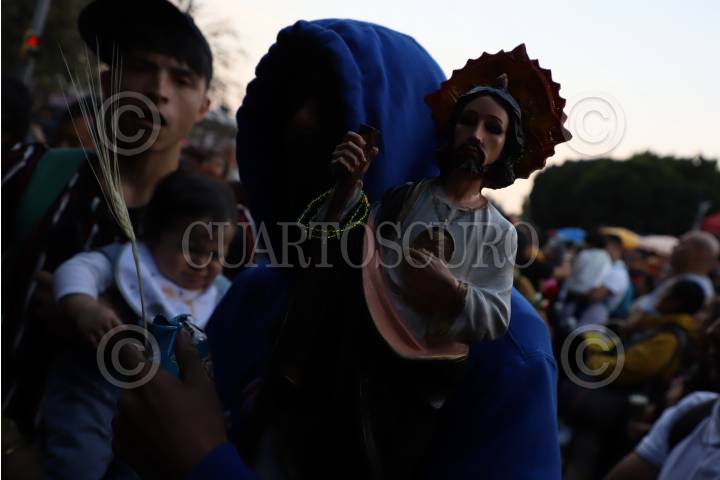 CIUDAD DE MÉXICO, 28OCTUBRE2024.- Una persona carga la figura de San Judas Tadeo afuera de la misa de San Hipólito. FOTO: DANIEL AUGUSTO/ CUARTOSCURO.COM
