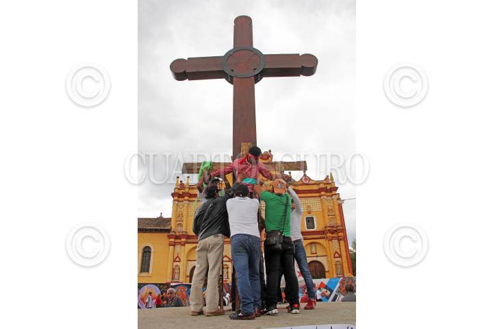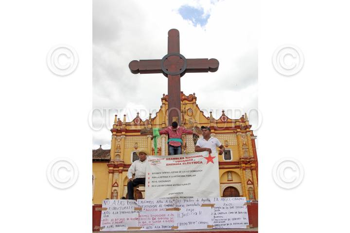 SAN CRISTÓBAL DE LAS CASAS, CHIAPAS, 06JUNIO2018.- Integrantes de la Asamblea Nacional de Usuarios de Energía Eléctrica realizaron una cricifixión simbólica para exigir al gobierno federal y estatal reduzca los altos costos de energía en la Zona Norte de la entidad, así como la cancelación de órdenes de aprehensión y justicia para el compañero Agustín Gómez Pérez, joven que se inmoló para hacerse escuchar. Mantienen un plantón indefinido desde el pasado 28 de mayo en la Plaza de la Paz en el centro de la ciudad. FOTO: JACOB GARCÍA /CUARTOSCURO.COM