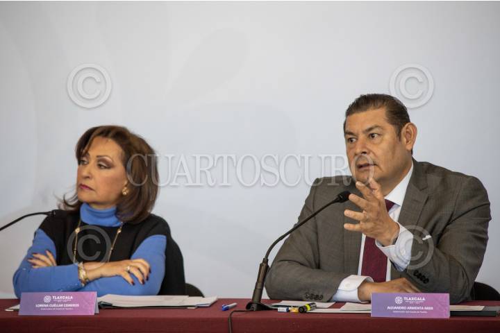 TLAXCALA, TLAXCALA, 31ENERO2025.- Lorena Cuellar Cisneros y Alejandro Armenta Mier, gobernadores constitucionales de los estados de Tlaxcala y Puebla respetivamente, se observan durante la conferencia de prensa que ofrecieron a medios luego de que que se llevara a cabo la firma de un convenio de colaboracion entre las dos entidades con la finalidad de reducir los altos indices delictivos que se presentan en la región limítrofe entre ambos estados. En Tlaxcala se han incrementado exponencialmente los indices de violencia, al respecto la Encuesta Nacional de Seguridad Pública Urbana (ENSU) 2025 revelan que en Tlaxcala la percepción de inseguridad incrementó en diciembre de 2024 respecto a las cifras reveladas en septiembre del mismo año. FOTO: J. GUADALUPE PÉREZ/CUARTOSCURO.COM