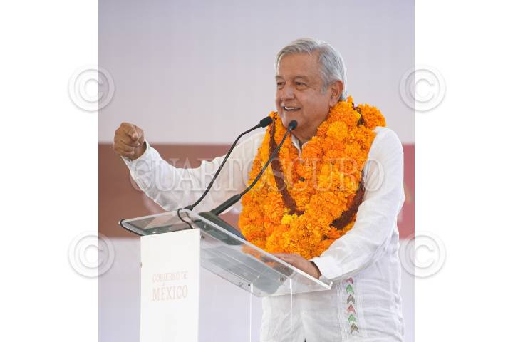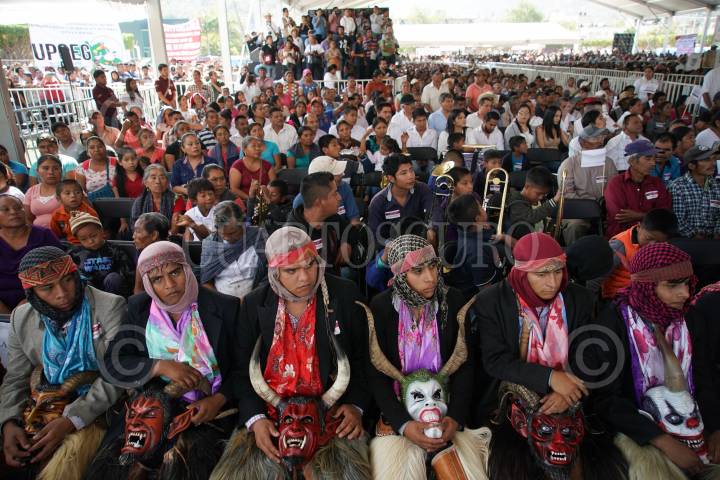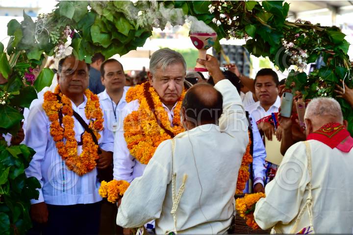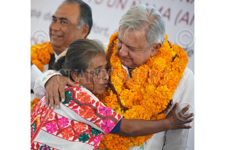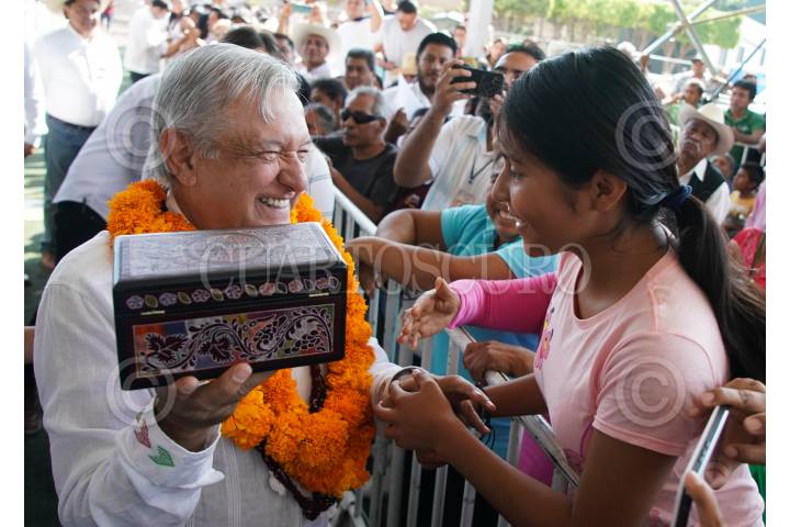 TLAPA DE COMONFORT, GUERRERO, 24NOVIEMBRE2019.- Andrés Manuel López Obrador, Presidente de México, encabezó el "Diálogo con los Pueblos Tlapaneco, Mixteco, Amuzgo y Náhuatl", ahí convivió con pobladores de estas comunidades, quienes le brindaron varios presentes, en su discurso señalo que la desaparición de los 43 estudiantes de Ayotzinapa no era un crimen de estado. FOTO: PRESIDENCIA /CUARTOSCURO.COM