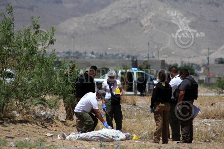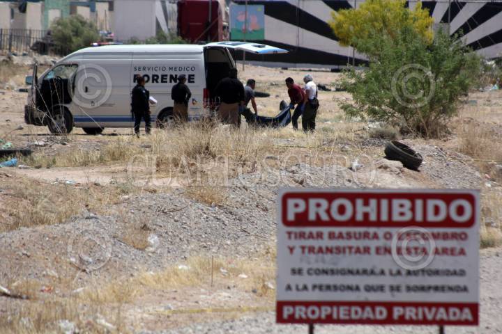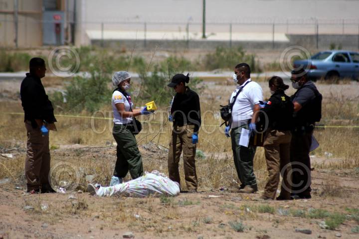 CIUDAD JUÁREZ, CHIHUAHUA, 17MAYO2018.- El cuerpo de una mujer sin vida, fue encontrado envuelto en una sábana blanca, fue abandonado en un terreno baldío en la colonia Sierra Grande. El hallazgo se realizó en la avenida Miguel de la Madrid y Ramón Rayón, por una persona que caminaba por el predio. Según la información, la mujer tenía las manos atadas a la espalda y una bolsa de plástico en la cabeza, se le alcanzaba a apreciar un tenis rosa. Al lugar acudió la Fiscalía General del Estado para realizar las investigaciones correspondientes y proceder con el levantamiento del cuerpo. FOTO: NACHO RUIZ /CUARTOSCURO.COM