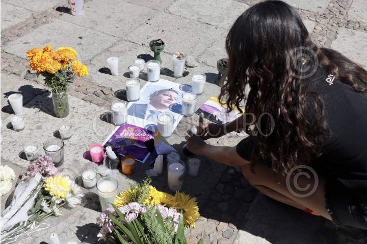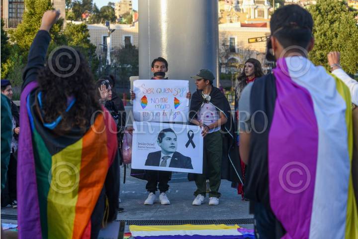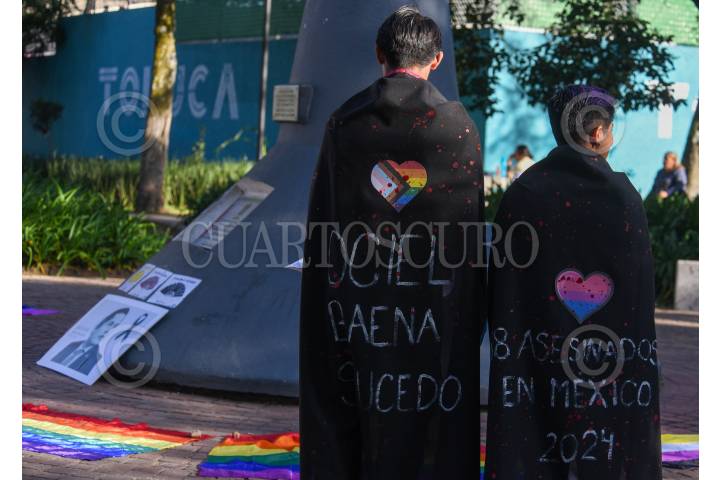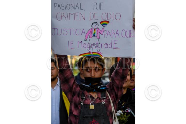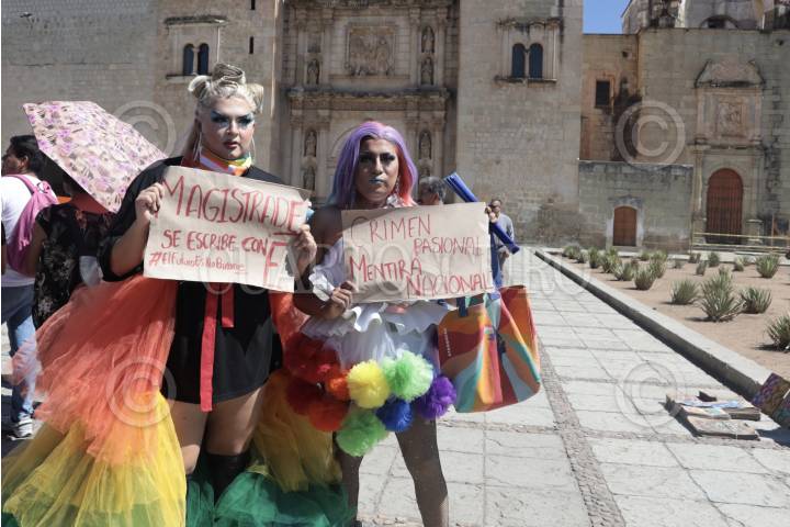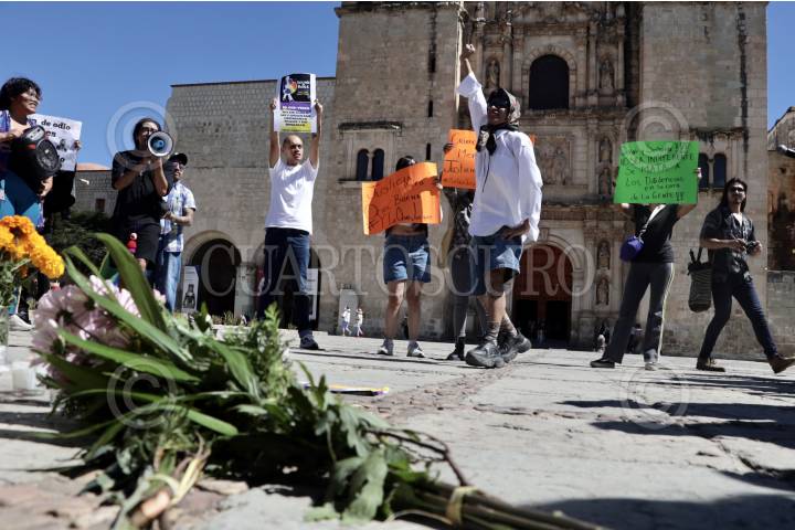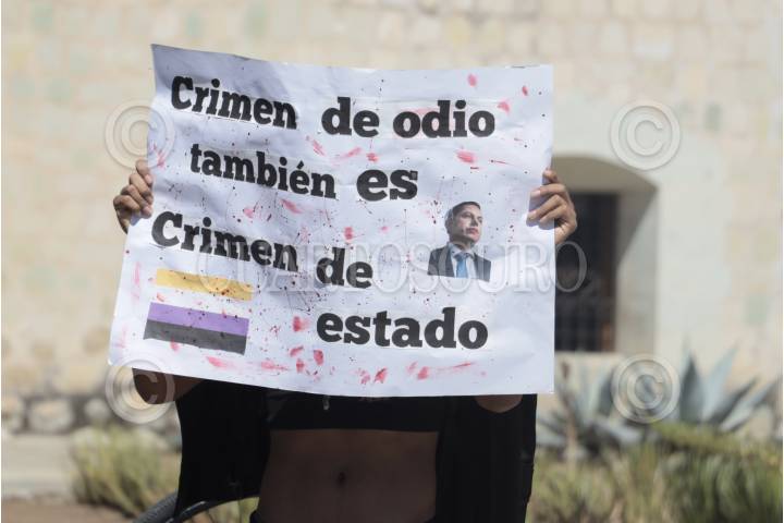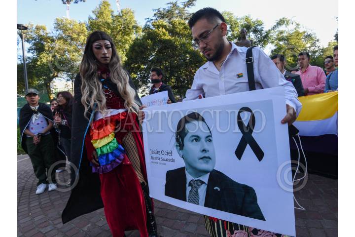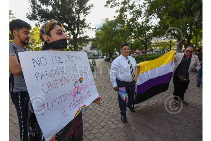 OAXACA, OAXACA, 14NOVIEMBRE2023.- Integrantes de la comunidad LGBTQ+ se manifestaron en el atrio del templo de Santo Domingo de Guzmán, en la capital de Oaxaca, para exigir justicia para el magistrade Jesús Ociel Baena Saucedo. Además exigieron leyes firmes para castigar crimines de odio contra la comunidad. FOTO: CAROLINA JIMÉNEZ/CUARTOSCURO.COM