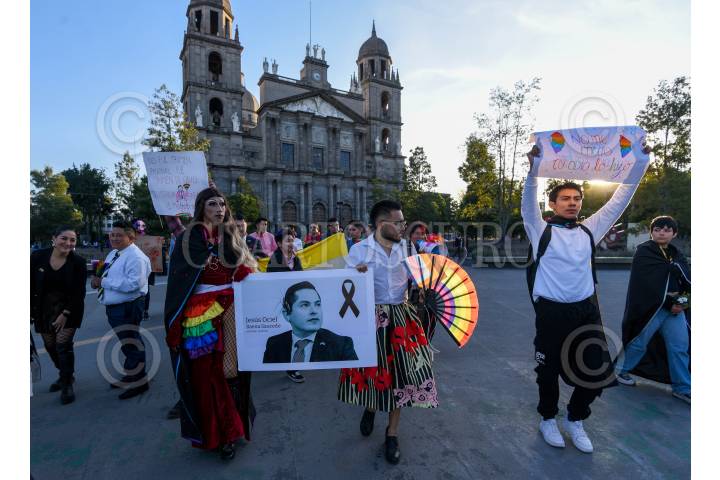 TOLUCA, ESTADO DE MÉXICO, 13NOVIEMBRE2024.- A un año de la muerte del Magistrade Jesús Ociel Baena, integrantes de la comunidad LGBTTTIQA+ realizaron una marcha en la ciudad de Toluca para exigir justicia así como castigo a los crímenes de odio. FOTO: CRISANTA ESPINOSA AGUILAR /CUARTOSCURO.COM