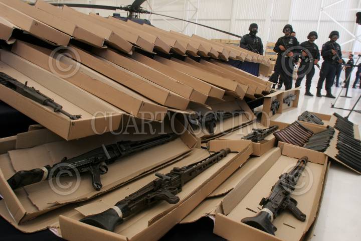 MÉXICO, D.F., 22OCTUBRE2010.- Elementos de la Policía Federal, presentaron ante los medios de comunicación a 2 personas vinculadas con el el grupo delictivo de los zetas detenidos el día de ayer en la ciudad de Cardenas Tabasco, según informes de la Secretaria de Seguridad Pública Federal, estas dos personas fueron detenidas cuando circulaban abordo de una camioneta pick-up, donde transportaban 73 armas largas de alto poder, 2 armas cortas, 12 granadas , 2,274 cartuchos y dos kilogramos de cocaína. FOTO: SAÚL LÓPEZ/CUARTOSCURO.COM