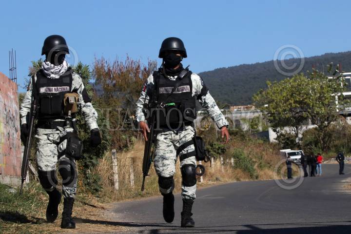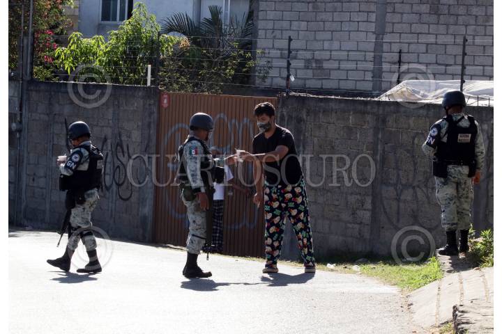 Un joven regala un vaso de ponche de frutas a unos elementos de la Guardia Nacional que resguardan una escena de crimen.