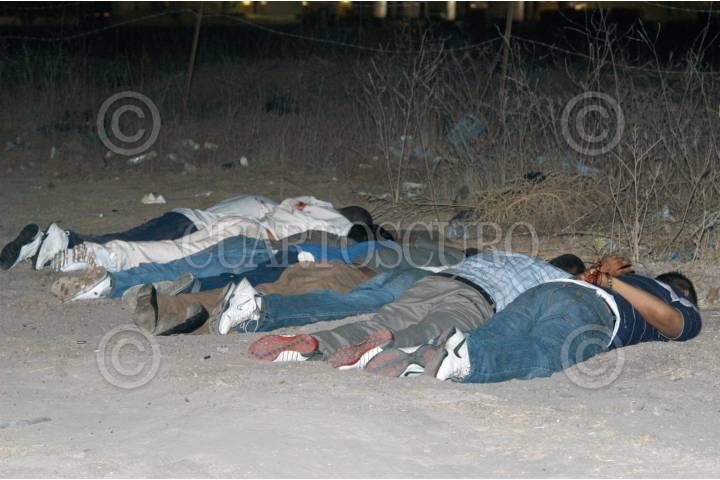 TIJUANA, BAJA CALIFORNIA, 02OCTUBRE2008.- Con el tétrico hallazgo de nueve personas asesinadas esta madrugada, se alcanzó la cifra de 402 ejecutados en lo que va del año en Tijuana. Cantidad muy superior a las 335 ejecuciones cometidas aquí el año pasado. A las tres horas con treinta minutos un reporte telefónico al 066 movilizó a las autoridades hasta la parte posterior del Parque Industrial Pacífico. En un lote baldío, cerca de la entrada al fraccionamiento Barcelona Residencial, los uniformados vieron con estupor ocho cadáveres colocados boca abajo, en una ordenada fila. Todos tenían las manos atadas a la espalda y mostraban numerosos impactos de bala. Varios de ellos tenían dedos mutilados. Sus edades oscilan entre los 20 y los 30 años. Alrededor de los cadáveres las autoridades encontraron 69 casquillos de armas de diferentes calibres, principalmente de “cuernos de chivo”, lo que demuestra que allí fue la masiva ejecución. FOTO: EL-MEXICANO/CUARTOSCURO.COM
