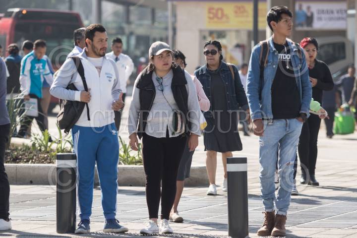 Dos mujeres esperan el alto para cruzar la avenida sobre el nuevo paso peatonal en la Alcaldía Azcapotzalco.