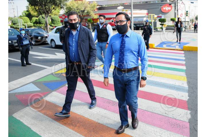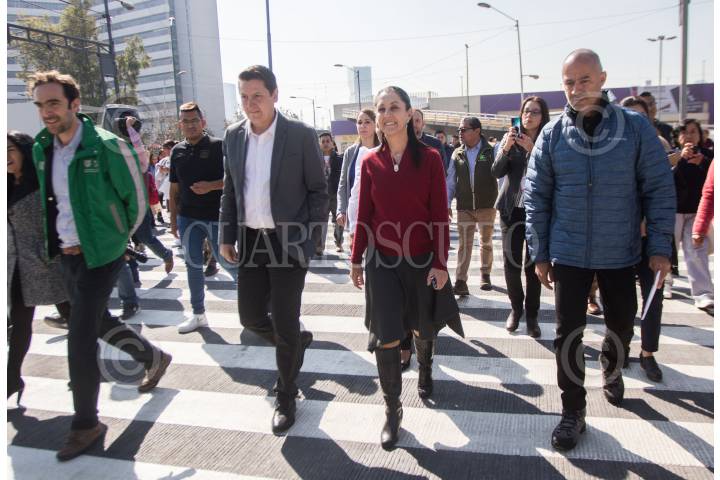 Victor Hugo Romo, alcalde de Miguel Hidalgo y Vidal Llerenas, alcalde de Azcapotzalco utilizan el nuevo cruce peatonal de la avenida 5 de Mayo.
