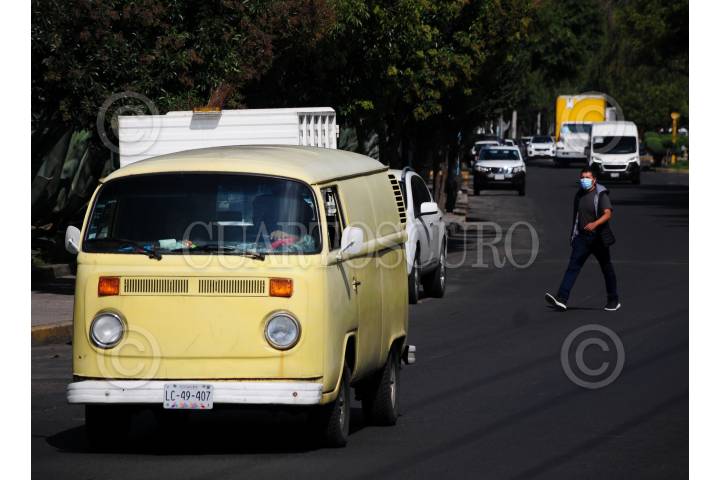 Un hombre pasa por la avenida 5 de Mayo enmedio del tráfico.