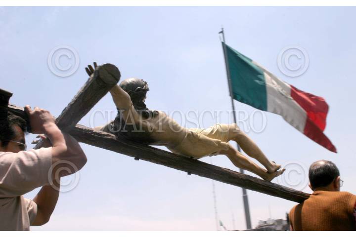 MEXICO; D.F., 26MAYO2005.- Trabajadores de la Catedral Metropolitana, trasladan un crucifijo por la plancha del Zócalo. FOTO: Moisés Pablo/CUARTOSCURO.COM