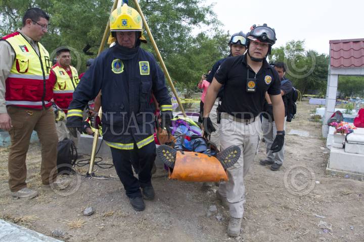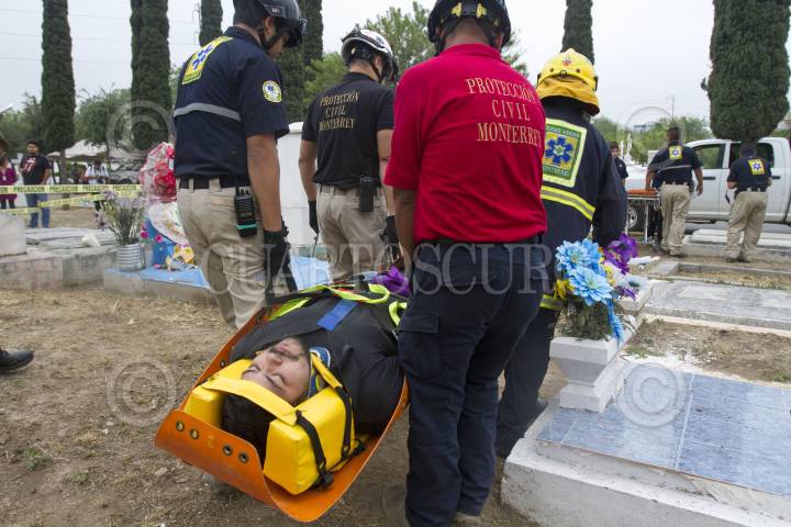 MONTERREY, NUEVO LEÓN, 08MAYO2017.- Elementos de la Crúz Verde y Protección Civil realizaron un simulacro en el panteón municipal en donde rescatan a una persona caida en una tumba vacía, debido a la afluencia por el día de las madres. FOTO: GABRIELA PÉREZ MONTIEL /CUARTOSCURO.COM