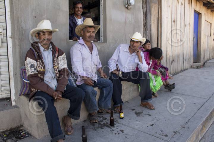 COCHOAPA EL GRANDE, GUERRERO, 25DICIEMBRE2014.- Los contrastes son visibles en el muncipio de Cochoapa el Grande, Guerrero, catalogado como el más pobre del país de acuerdo con cifras del 2006 de la Conapo. Las luminarias modernas resaltan con las casas de madera y adobes sobre la calle principal del pueblo. Con la visita del presidente Peña Nieto en enero de este año se construyeron casas y comedores comunitarios para la gente, también se implementaron programas gubernamentales de apoyo para el campo y las mujeres productoras, no obstante, la calidad de vida no ha mejorado en mucho, pues los recursos recibidos terminan convertidos en muchos casos en botellas de alcohol o antenas de televisión de paga que contrastan con los techos de lámina de las casas de madera. En el pueblo también hay presencia del narcotráfico, el cual no puede ser combatido por la policia municipal pues afirman que no pueden hacer nada con sus rifles contra los cuernos de chivo. En la imagen, hombres beben cervezas durante la tarde, al fondo, la esposa de uno espera aburrida que termine de beber. FOTO: DAVID POLO /CUARTOSCURO.COM