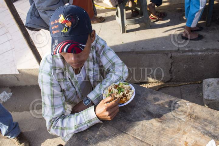 COCHOAPA EL GRANDE, GUERRERO, 25DICIEMBRE2014.- Los contrastes son visibles en el muncipio de Cochoapa el Grande, Guerrero, catalogado como el más pobre del país de acuerdo con cifras del 2006 de la Conapo. Las luminarias modernas resaltan con las casas de madera y adobes sobre la calle principal del pueblo. Con la visita del presidente Peña Nieto en enero de este año se construyeron casas y comedores comunitarios para la gente, también se implementaron programas gubernamentales de apoyo para el campo y las mujeres productoras, no obstante, la calidad de vida no ha mejorado en mucho, pues los recursos recibidos terminan convertidos en muchos casos en botellas de alcohol o antenas de televisión de paga que contrastan con los techos de lámina de las casas de madera. En el pueblo también hay presencia del narcotráfico, el cual no puede ser combatido por la policia municipal pues afirman que no pueden hacer nada con sus rifles contra los cuernos de chivo. En la imagen, un hombre que se dedica a las peleas de gallos desayuna un pozole en la plaza del pueblo. FOTO: DAVID POLO /CUARTOSCURO.COM