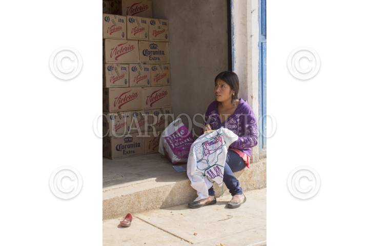COCHOAPA EL GRANDE, GUERRERO, 25DICIEMBRE2014.- Los contrastes son visibles en el muncipio de Cochoapa el Grande, Guerrero, catalogado como el más pobre del país de acuerdo con cifras del 2006 de la Conapo. Las luminarias modernas resaltan con las casas de madera y adobes sobre la calle principal del pueblo. Con la visita del presidente Peña Nieto en enero de este año se construyeron casas y comedores comunitarios para la gente, también se implementaron programas gubernamentales de apoyo para el campo y las mujeres productoras, no obstante, la calidad de vida no ha mejorado en mucho, pues los recursos recibidos terminan convertidos en muchos casos en botellas de alcohol o antenas de televisión de paga que contrastan con los techos de lámina de las casas de madera. En el pueblo también hay presencia del narcotráfico, el cual no puede ser combatido por la policia municipal pues afirman que no pueden hacer nada con sus rifles contra los cuernos de chivo. En la imagen, una mujer borda mientras cuida uno de los varios depósitos de cerveza que hay en el pueblo. FOTO: DAVID POLO /CUARTOSCURO.COM