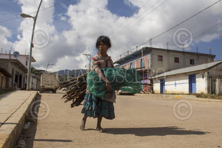 COCHOAPA EL GRANDE, GUERRERO, 25DICIEMBRE2014.- Los contrastes son visibles en el muncipio de Cochoapa el Grande, Guerrero, catalogado como el más pobre del país de acuerdo con cifras del 2006 de la Conapo. Las luminarias modernas resaltan con las casas de madera y adobes sobre la calle principal del pueblo. Con la visita del presidente Peña Nieto en enero de este año se construyeron casas y comedores comunitarios para la gente, también se implementaron programas gubernamentales de apoyo para el campo y las mujeres productoras, no obstante, la calidad de vida no ha mejorado en mucho, pues los recursos recibidos terminan convertidos en muchos casos en botellas de alcohol o antenas de televisión de paga que contrastan con los techos de lámina de las casas de madera. En el pueblo también hay presencia del narcotráfico, el cual no puede ser combatido por la policía municipal pues afirman que no pueden hacer nada con sus rifles contra los cuernos de chivo. En la imagen, una mujer con retraso mental lleva una carga de leños. FOTO: DAVID POLO /CUARTOSCURO.COM
