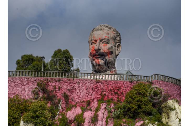 TOLUCA, ESTADO DE MÉXICO, 25AGOSTO2025.- A través de redes sociales se difundió un video en donde un grupo de personas encapuchadas realizaron pintas y martillazos a la cabeza de Lic. Adolfo López Mateos que se encuentra en el Cerro de Coatepec en Ciudad Universitaria de la UAEMÉX, ya había sido intervenida en ocasiones anteriores como parte del paro universitario. FOTO: CRISANTA ESPINOSA AGUILAR/CUARTOSCURO.COM