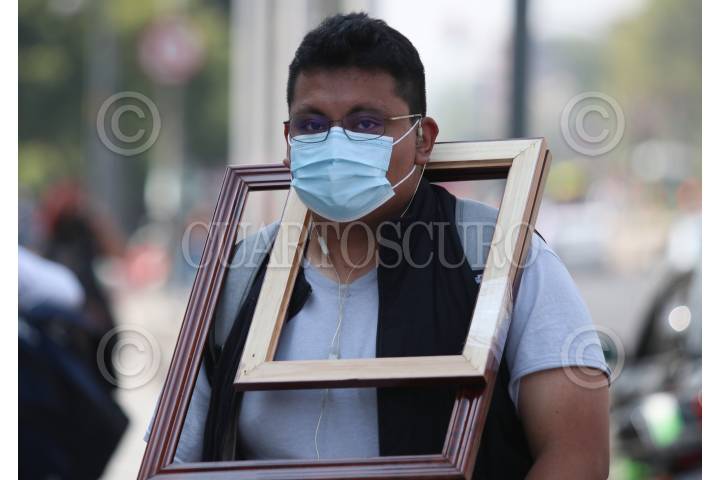 Un joven con dos cuadros colgados en su cuello mientras camina en el centro histórico.