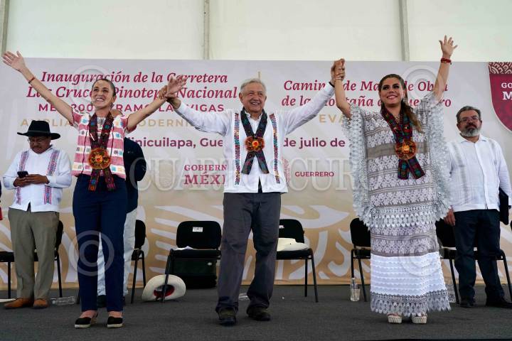 CUAJINICUILAPA, GUERRERO, 28JULIO2024.- Claudia Sheinbaum; Presidenta Electa de México; Andrés Manuel López Obrador, Presidente de México, y Evelyn Salgado, gobernadora de Guerrero; durante la inauguración de la carretera "Las Cruces – Pinotepa Nacional", en Unidad Deportiva Cuajinicuilapa. FOTO: PRESIDENCIA/CUARTOSCURO.COM