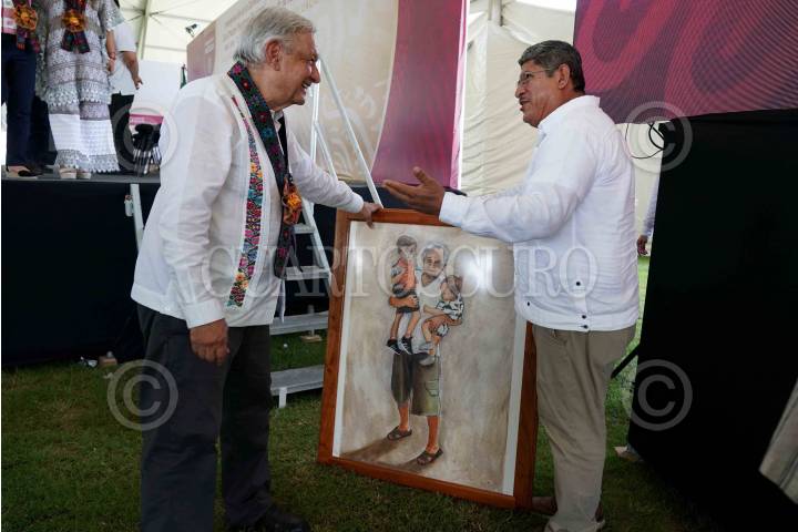CUAJINICUILAPA, GUERRERO, 28JULIO2024.- Andrés Manuel López Obrador, Presidente de México; recibió una pintura por parte de Edgardo Miguel Paz Rojas, Presidente Municipal de Cuajinicuilapa, durante la inauguración de la carretera "Las Cruces–Pinotepa Nacional", en Unidad Deportiva Cuajinicuilapa. FOTO: PRESIDENCIA/CUARTOSCURO.COM