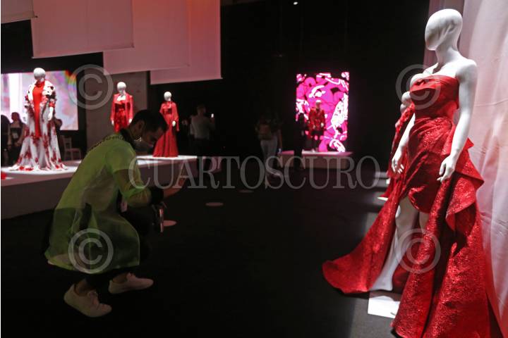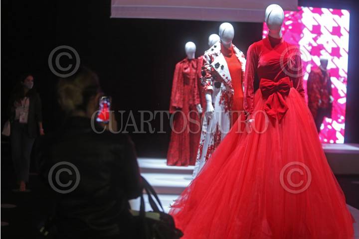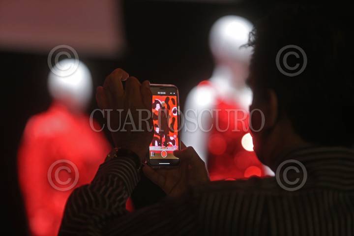 Asistentes a la inauguración de la edición 73 de Intermoda en donde se exhibió la nueva colección de Benito Santos, toman fotografías a los diseños en esta nueva normalidad en uno de los primeros eventos presenciales después de una larga cuarentena tras la Pandemia Sanitaria del Covid-19.