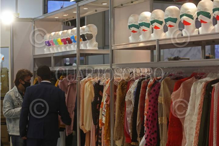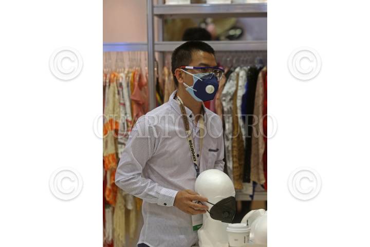Un expositor de origen asiático coloca un cubrebocas con diseño a un maniquí, esto después de la inauguración de la edición 73 de Intermoda, en uno de los primeros eventos presenciales después de una larga cuarentena tras la Pandemia Sanitaria del Covid-19.
