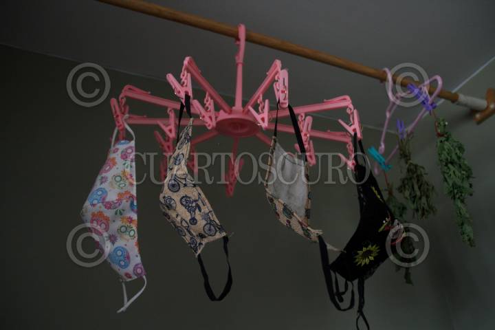 Aspectos de cubrebocas recién lavados a la par las ramas colgadas para tés que levantan defensas de manera natural
