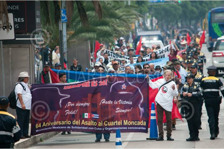 Cubanos avecindados en México y simpatizantes del régimen de aquel país marcharon para conmemorar el 68 Aniversario del Asalto al Cuartel Moncada.