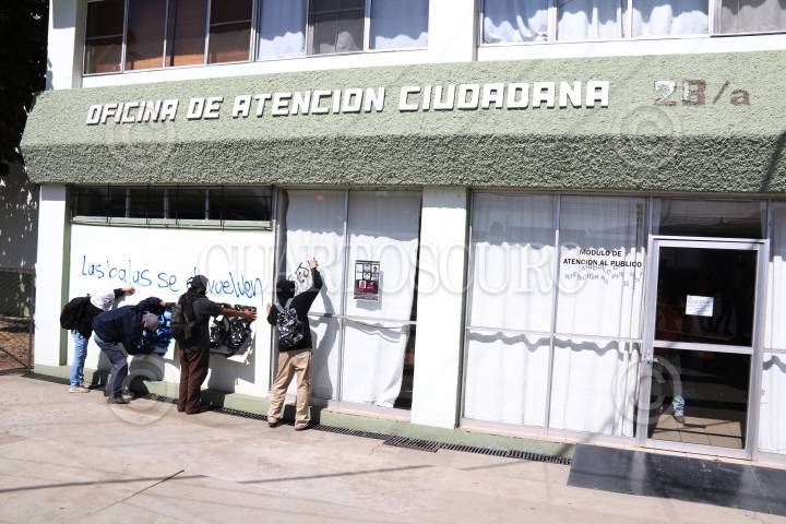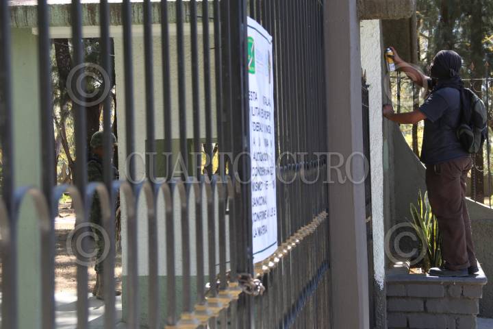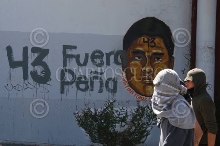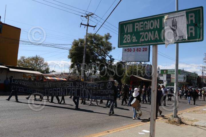 SANTA LUCÍA DEL CAMINO, OAXACA, 15ENERO2015.- Jóvenes anarquistas realizaron una marcha en la ciudad de Oaxaca y en el municipio de Santa Lucía del Camino en la que visitaron la 28ª Zona Militar y la penitenciaría Central, esto con el objetivo de exigir la liberación de los 7 detenidos en Eloxochitlán de Flores Magón acusados del homicidio del hijo del ex alcalde, mismo que provocó un ataque armado a los integrantes de la asamblea comunitaria el pasado 14 de diciembre, además para oponerse a los proyectos eólicos en el Istmo de Tehuantepec y para exigir la presentación con vida de los 42 estudiantes desaparecidos de Ayotzinapa, Guerrero. Los jóvenes encapuchados realizaron pintas tanto en el cuartel como en la penitenciaría. FOTO: ARTURO PÉREZ ALFONSO /CUARTOSCURO.COM